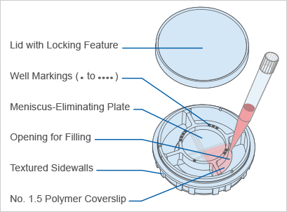 通過(guò)分隔成四個(gè)腔室,四格μ35mm培養(yǎng)皿增加了三倍的樣品數(shù)量和通量。這個(gè)特點(diǎn)非常適合在一個(gè)培養(yǎng)皿內(nèi)同時(shí)分析多個(gè)細(xì)胞株或者不同實(shí)驗(yàn)條件。
